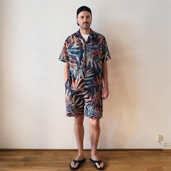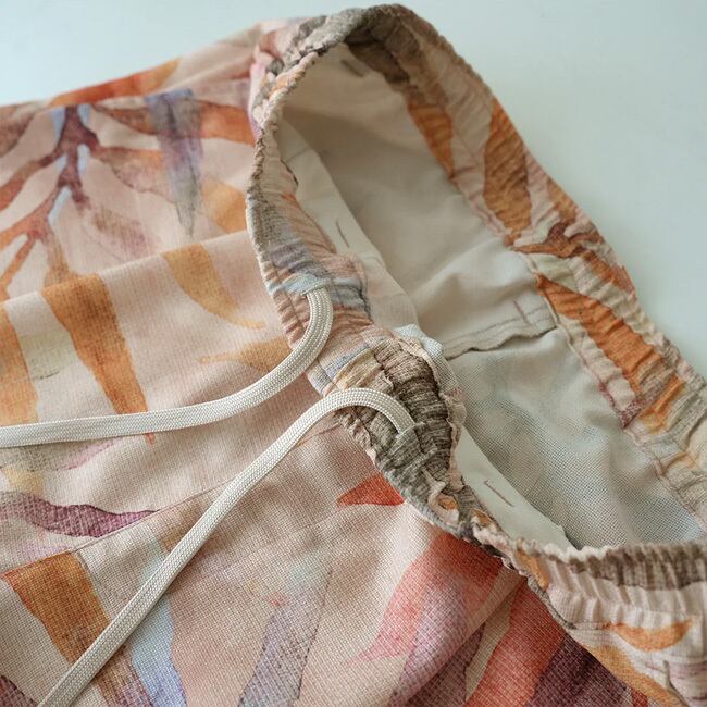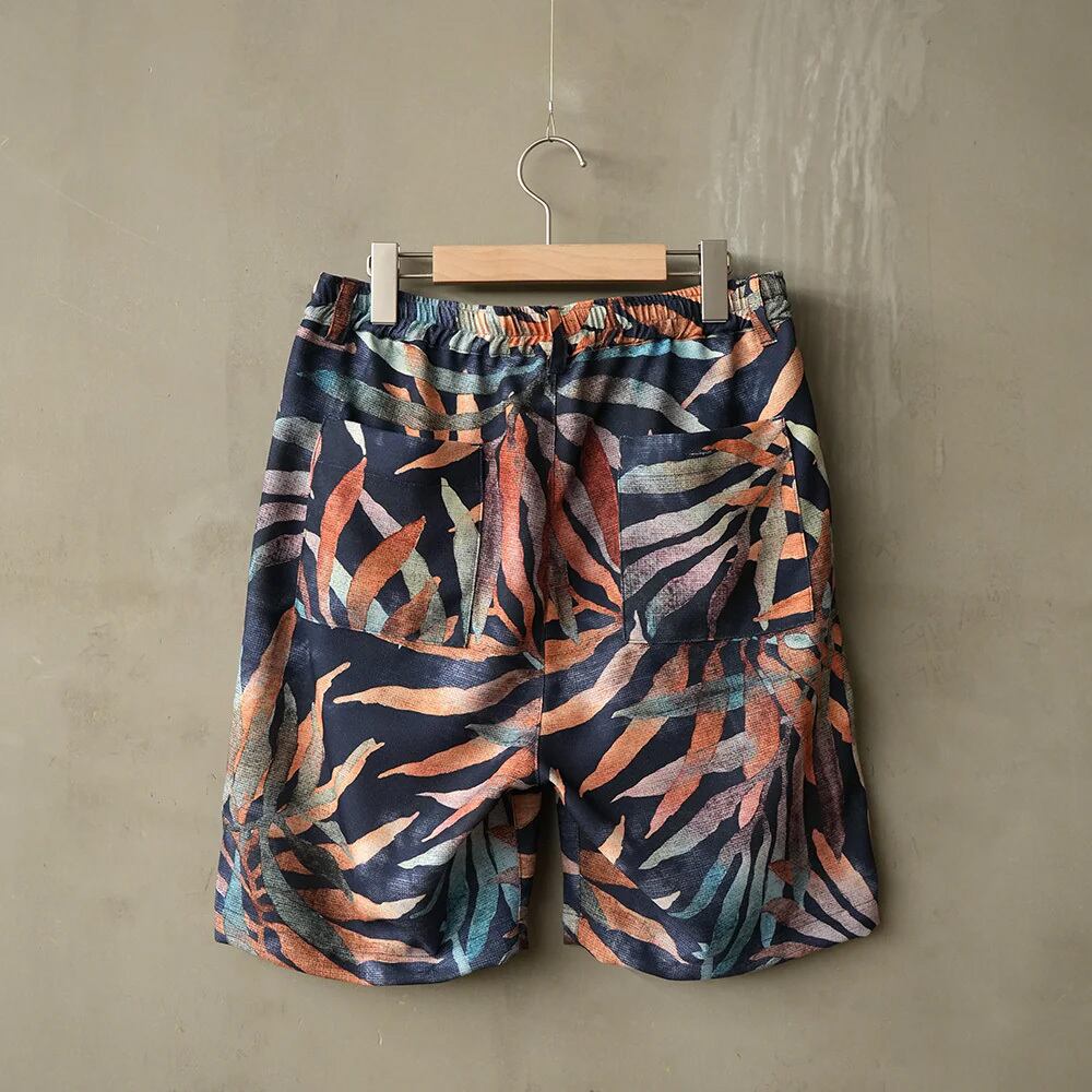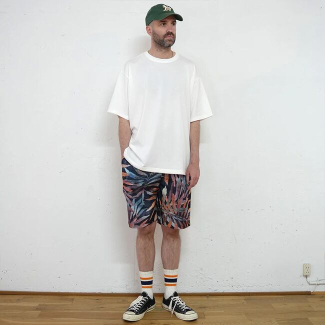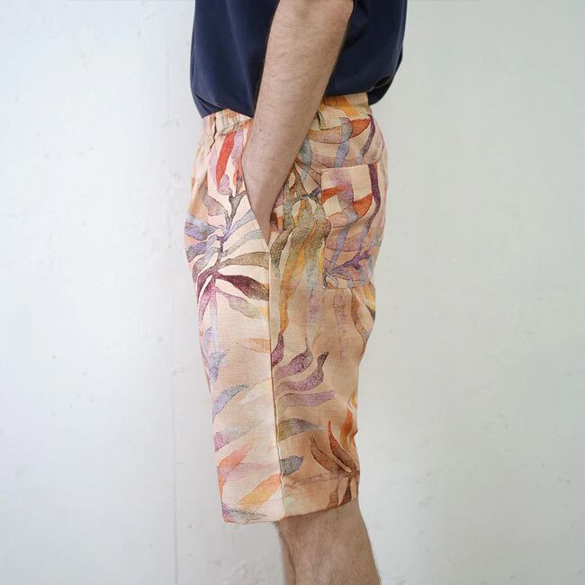 メッシュ組織のポリエステル素材に、ボタニカル柄をプリントしたオリジナルファブリックを使用したワンタックイージーショーツ。
