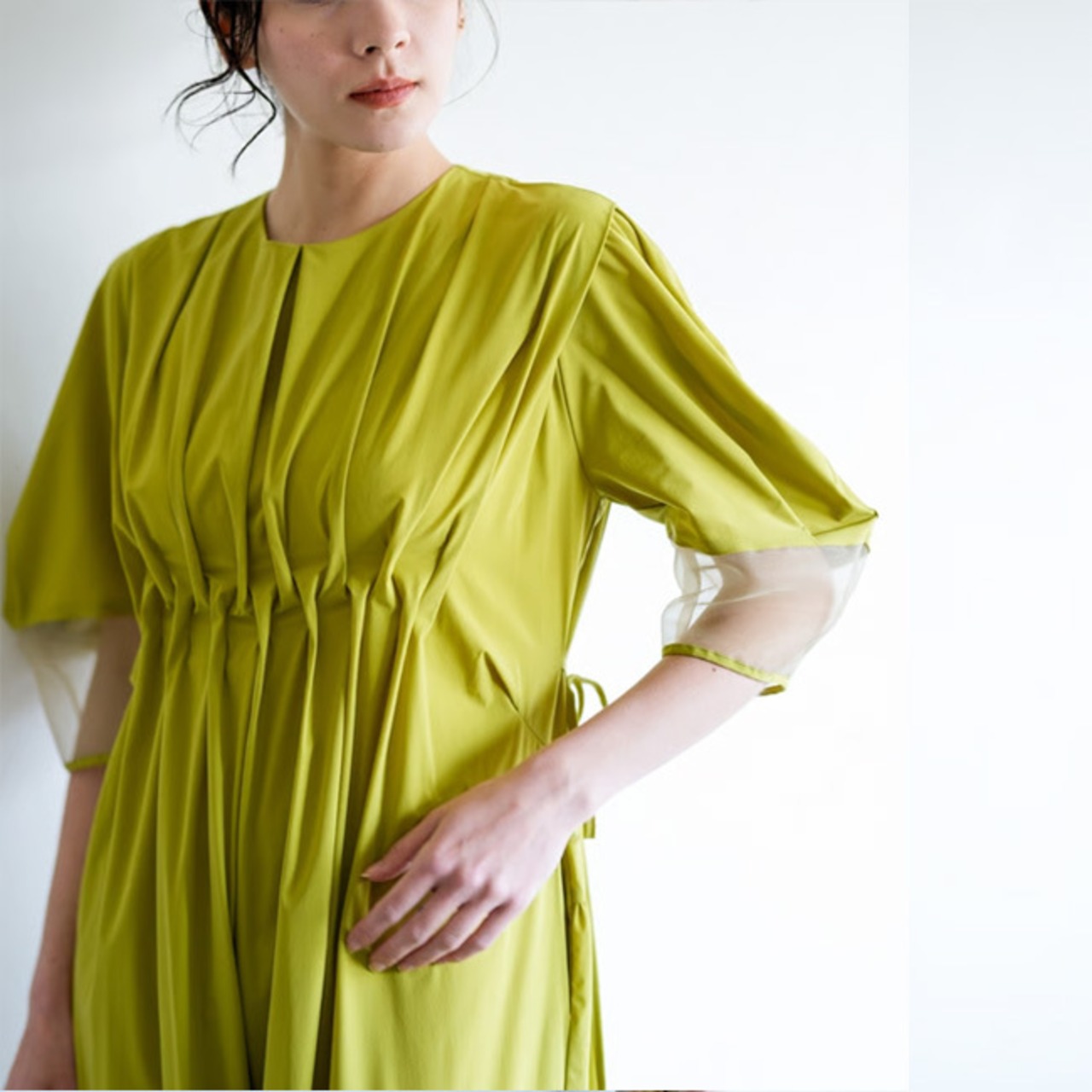 胸元の立体的なピンタックが目を引く超軽量ドレス。
