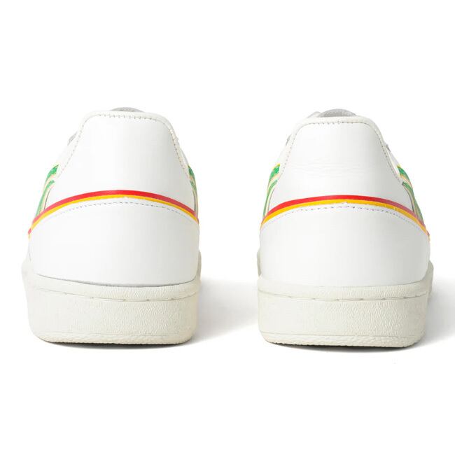 アッパーを飾るスムースレザーは、その滑らかな質感と落ち着いた光沢が、足元に上品な印象を与えます。そして、一見するとベーシックなホワイトスニーカーでありながら、巧みに配された色の重なりが、さりげない個性を主張します。この洗練されたディテールが、あなたの日常のスタイルにさりげないアクセントを加えてくれるでしょう。