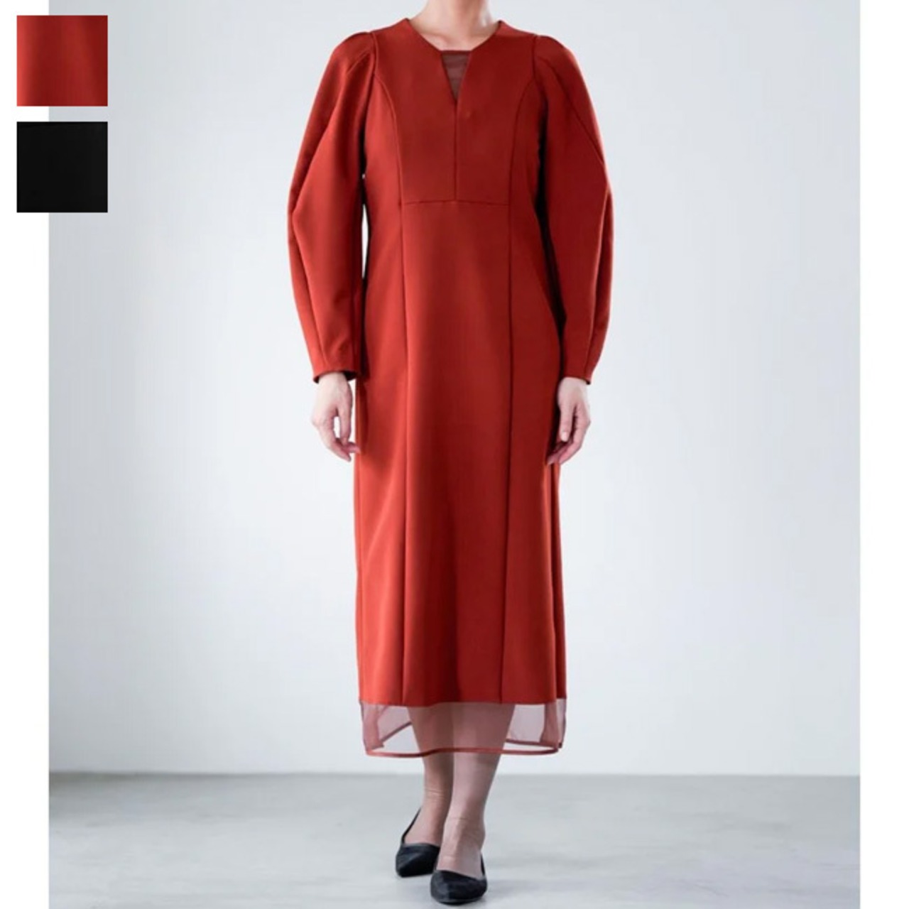 裾のオーガンジー仕様により足元に抜け感が出る。