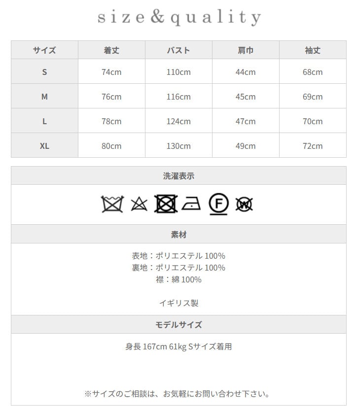 S:着丈74cm バスト110cm 肩巾44cm 袖丈68cm