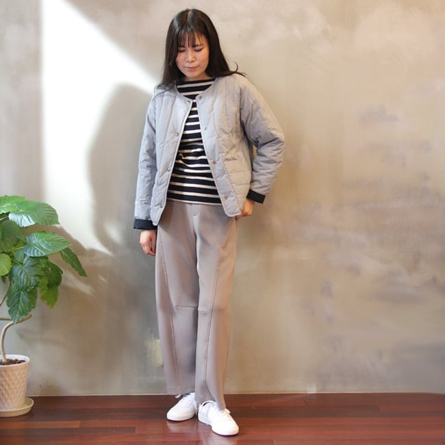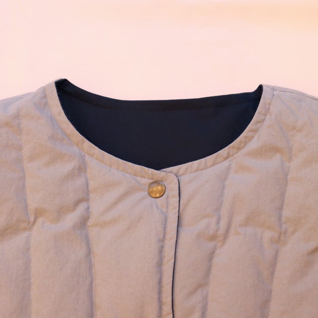 ノーカラーでリバーシブル仕様のショートダウンジャケット。