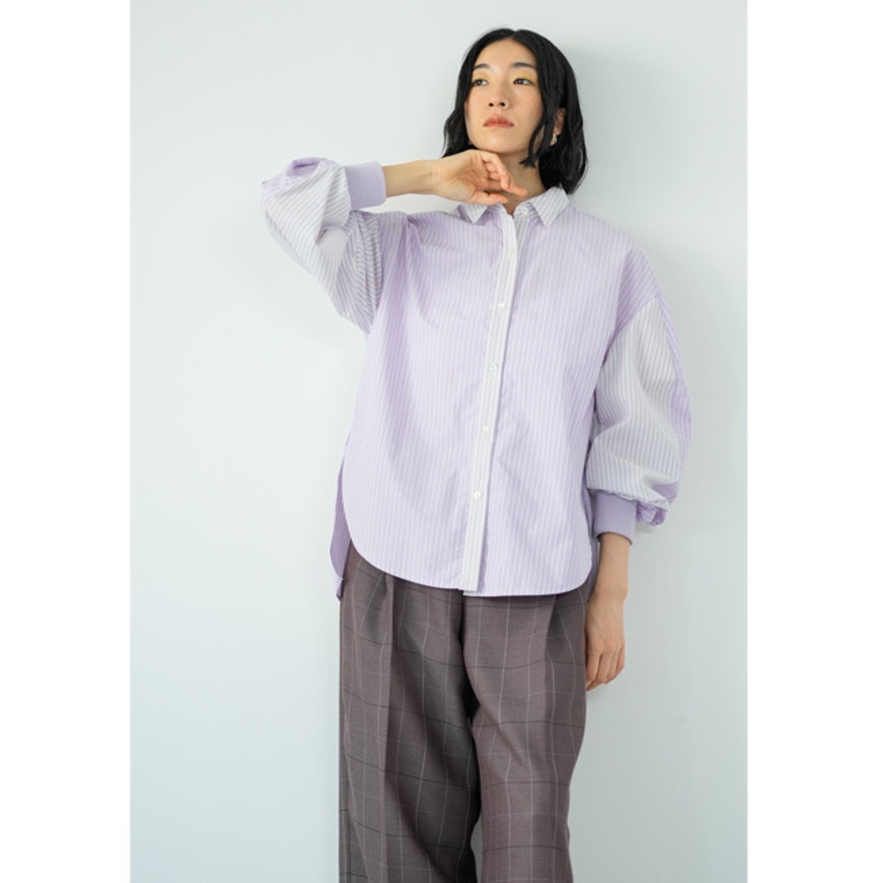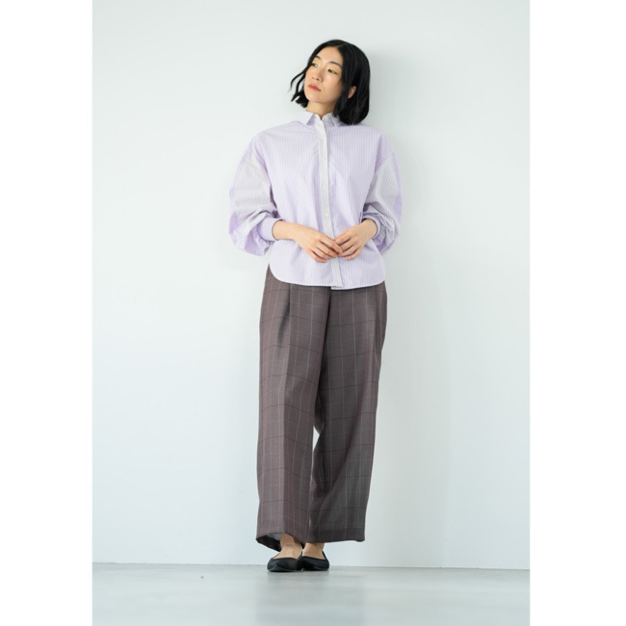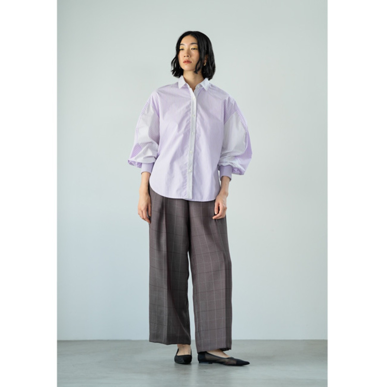 袖のボリュームで身頃をすっきりと見せ、