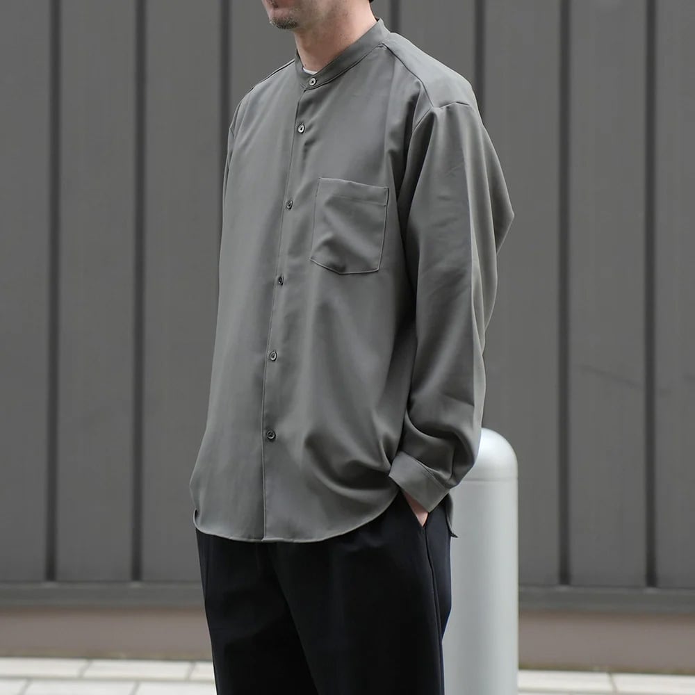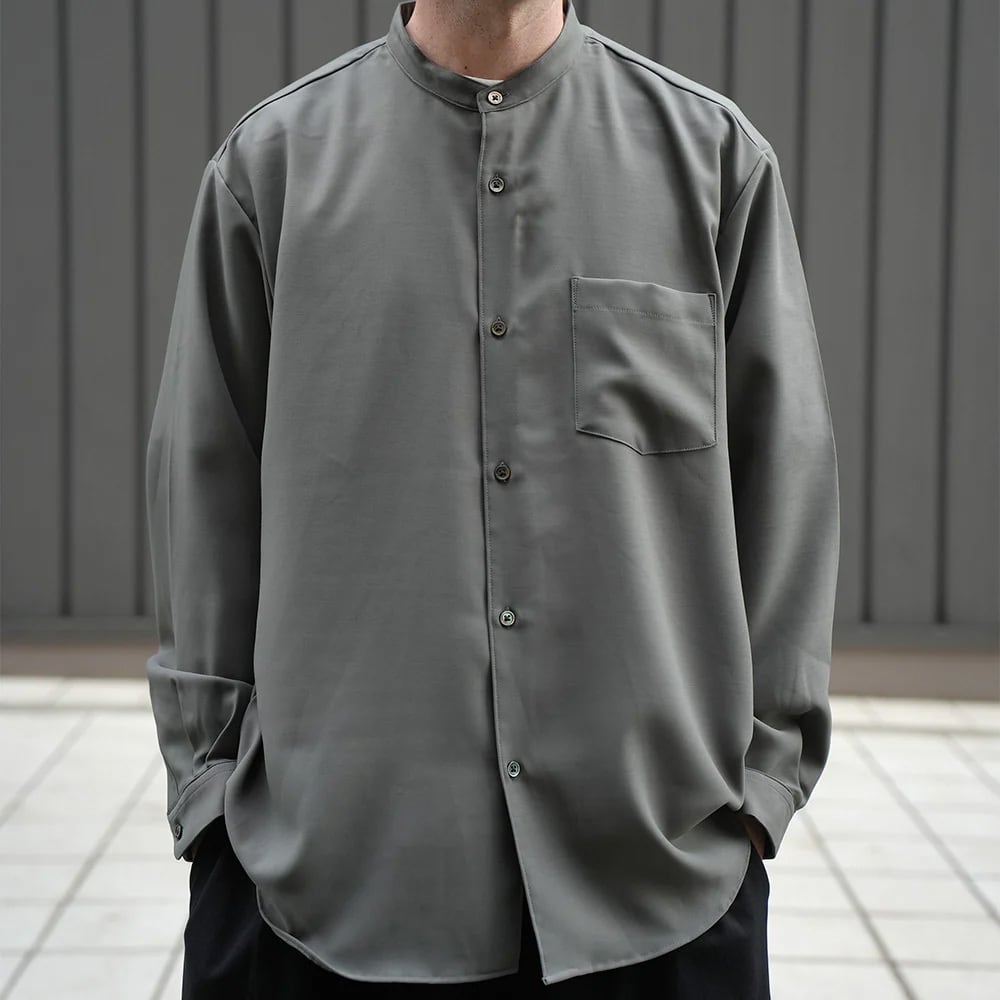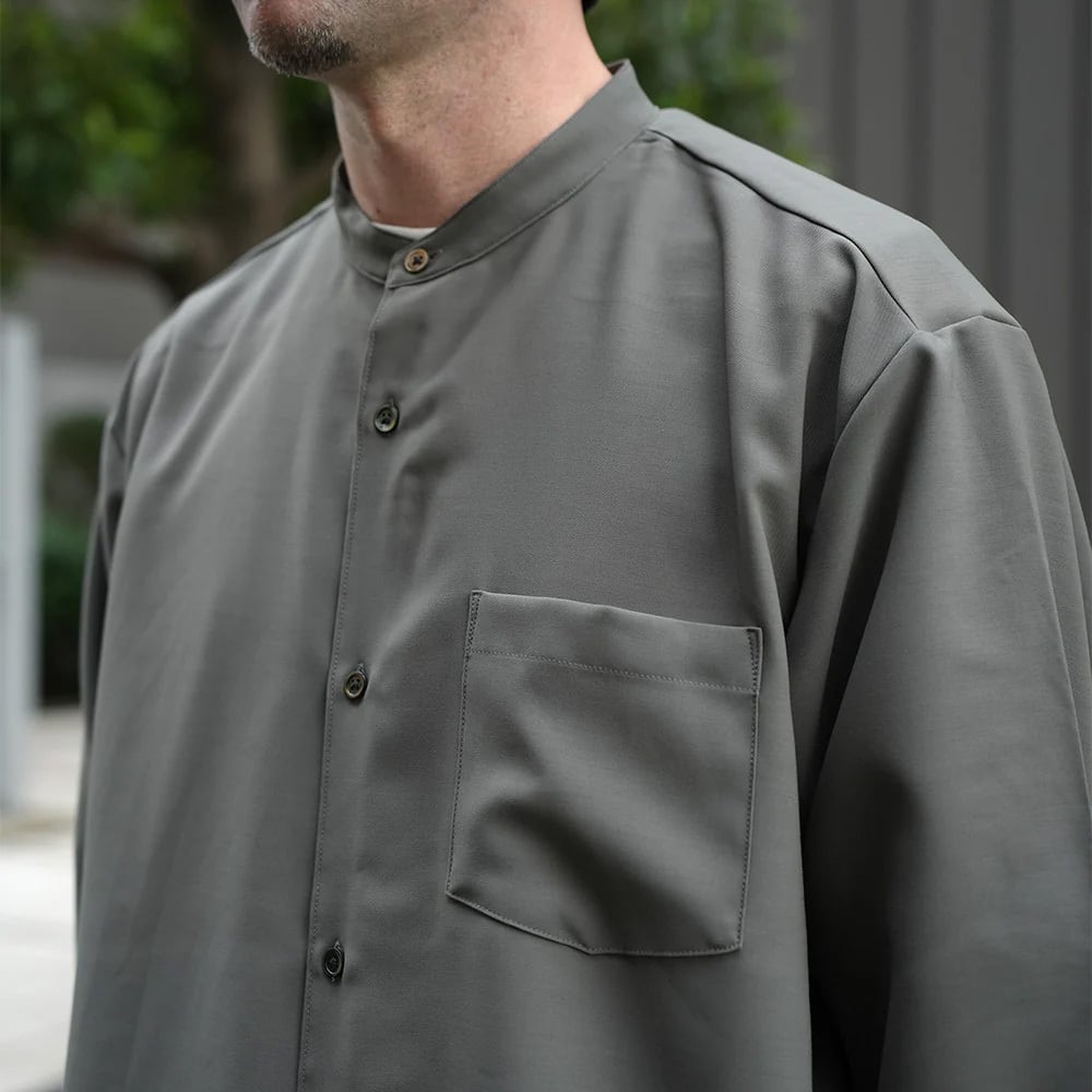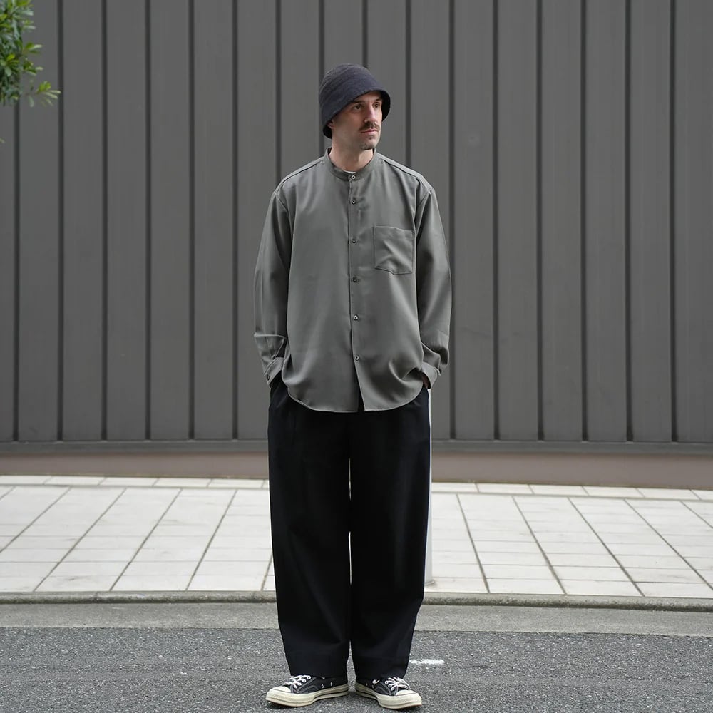 バンドカラーのワイドシャツ。