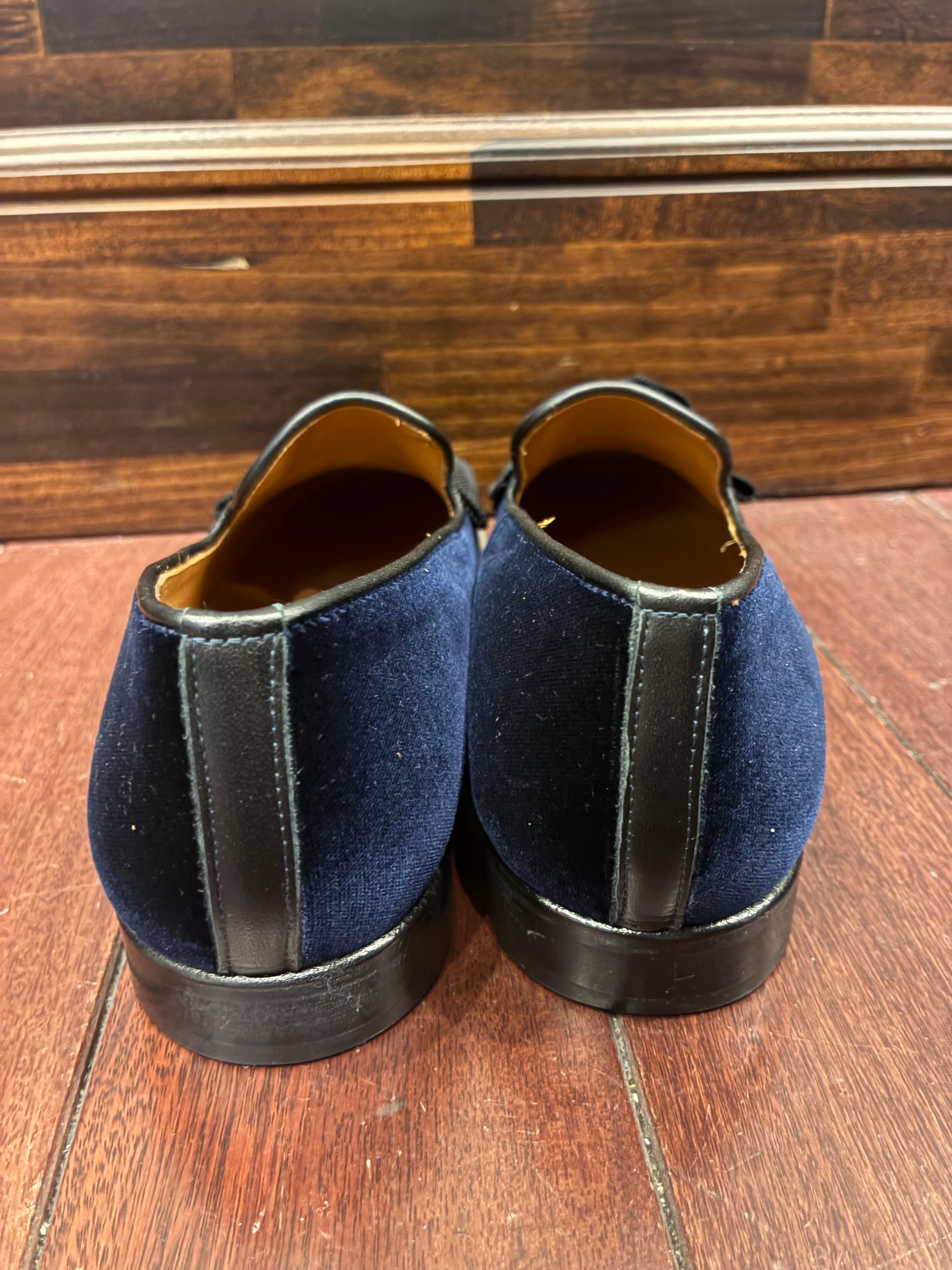 上品なネイビーベロア素材に、大きめのリボンがアクセントになったクラシカルなデザイン。