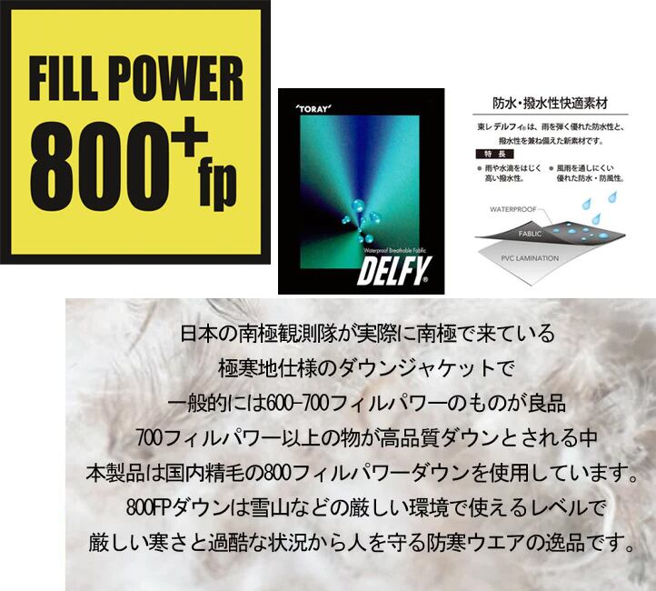 日本の南極観測隊が実際に南極で着ている極寒地仕様のダウンベストで一般的には600-700フィルパワーのものが良品、700フィルパワー以上の物が高品質ダウンとされるなか、本製品は国内精毛の800フィルパワーダウンを使用しています。